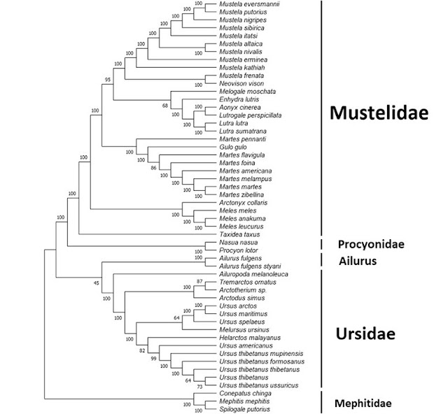 sequence identity metrics. Mustelids and ursids form two large clades, and
